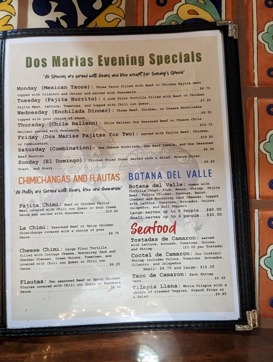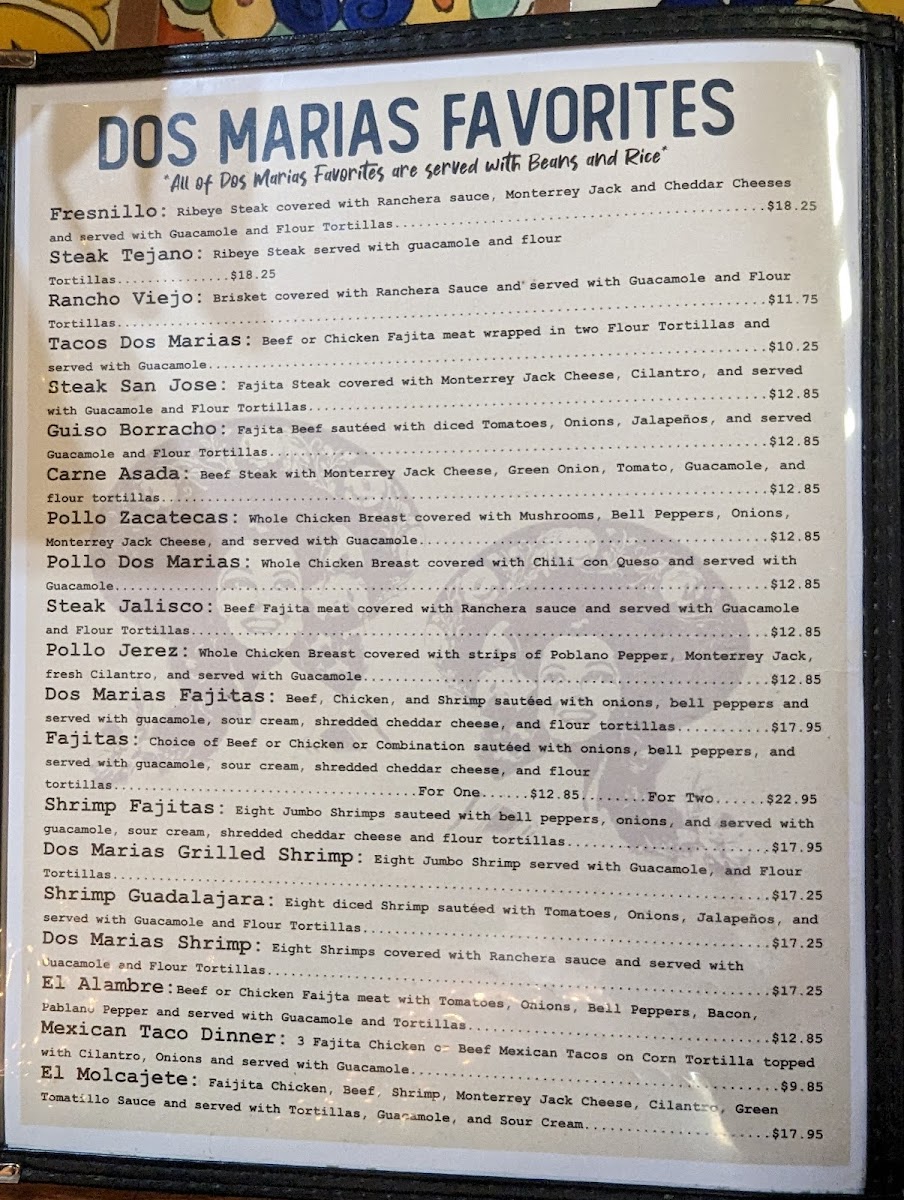 The menu at Dos Marias offers a welcoming blend of classic Mexican dishes presented with a straightforward, approachable style. It’s the kind of place where you can enjoy casual bites or a satisfying, comforting meal—all within a relaxed, homey atmosphere that invites you to take your time.